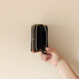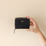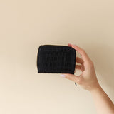 Billetera con solapa de cuero en color negro, acabado tipo reptil. Cierre de cremallera y a presión, tarjetero interior. Exterior e interior personalizado con logo grabado de HANG IT. Modelo hecho 100% con cuero vacuno.