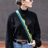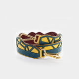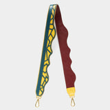Bandolera de cuero bicolor con terminación en el costado en forma de ondas, diseño calado en la parte frontal y mosquetones color oro.